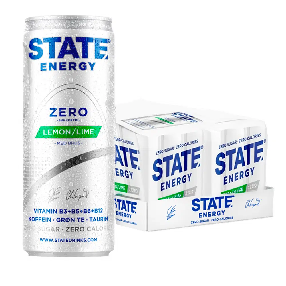 State Energy Lemon & Lime Zero tilbyder en klar, forfriskende citrusprofil af citron og lime med brus — uden tilsat sukker og med næsten ingen kalorier. Drikken indeholder en mild mængde salt og ingen fedt, kulhydrat eller protein pr. 100 ml. Den er tilsat udvalgte B-vitaminer samt koffein, grøn te og taurin, som ofte bruges i energidrikke for at give en opkvikkende effekt.